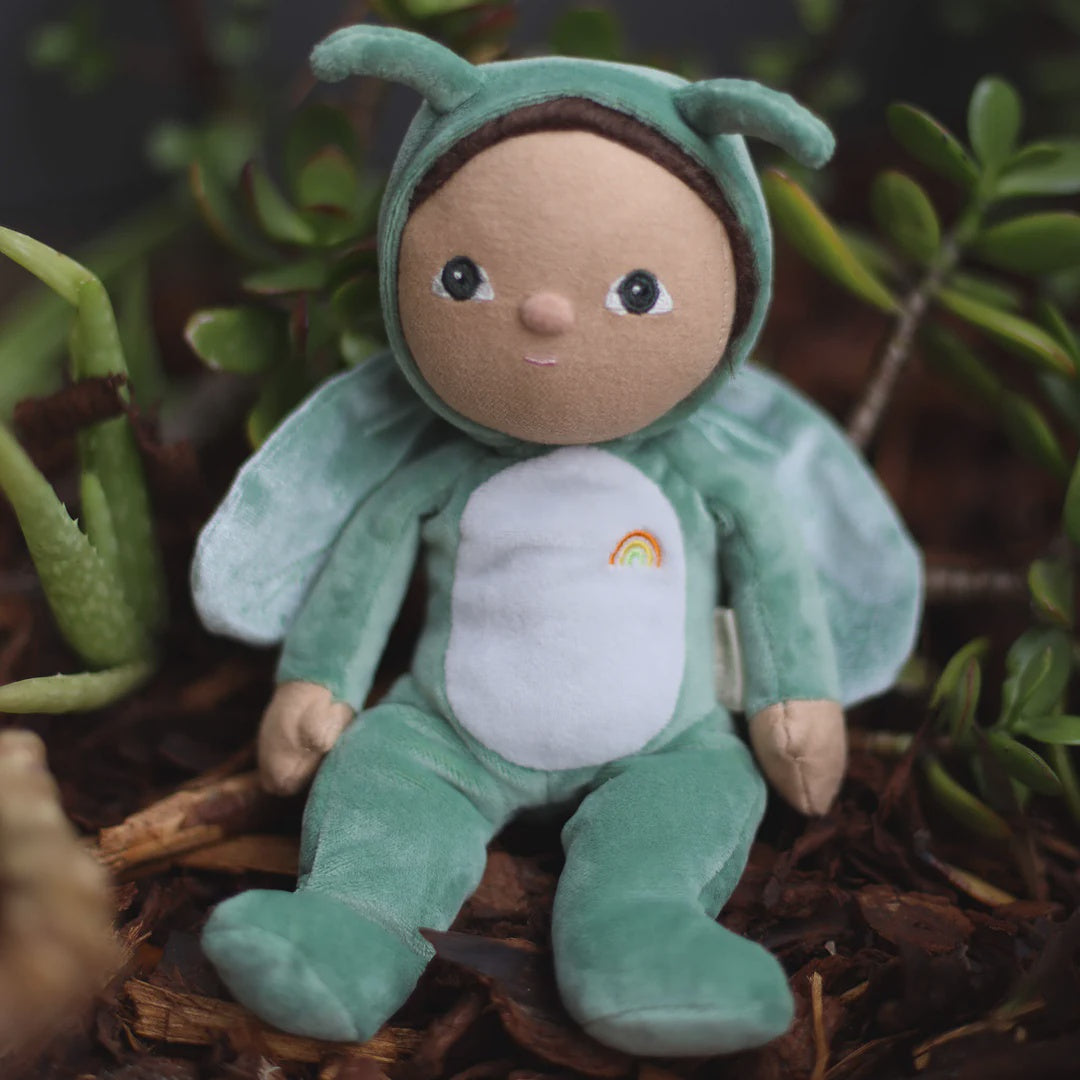 Gideon Grasshopper just loves to bounce, never still for long, there’s always something new to explore! Gideon is always mid-hop into the next backyard adventure. Dressed in a velvety soft green suit with shimmery wings and a matching little hood (complete with antennae, of course), this sprightly sidekick is made for movement, mischief, and maximum play.