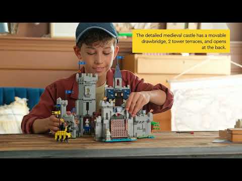 Introduce kids to fun medieval action with this LEGO Creator 3in1 Medieval Horse Knight Castle (31168) playset building toy. The detailed medieval castle toy opens at the back and is packed with cool features, including a movable drawbridge, great hall, stable, smithy, secret treasure chest, king's bedroom, writing room and 2 tower terraces.