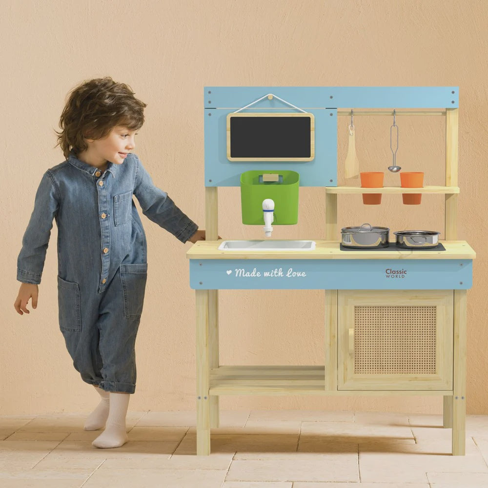 The Classic World Outdoor Kitchen invites young chefs to step into the great outdoors and cook up their own nature-inspired feasts. This beautifully crafted wooden kitchen is packed with interactive features, making it perfect for imaginative garden play.
